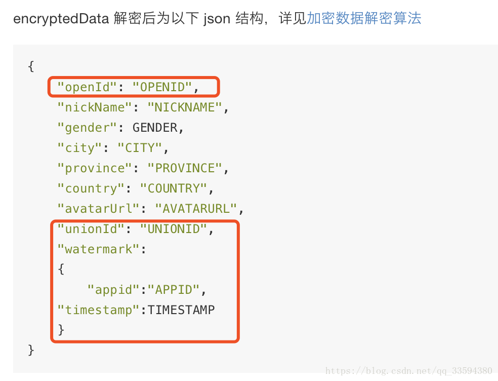 微信昵称 微信头像图片的URL,如果用户没有头像,URL会是空的。如果用户更换了头像,原有头像的URL会失效 用户性别:未知、男性、女性 所在国家 所在省份 所在城市 国家、省份、城市所用的语言:英文、简体中文、繁体中文 与用户信息一并返回的还有一串加密信息,转交给开发者的服务器解密之后,就可以得到用户的 OpenID 和 UnionID 了。