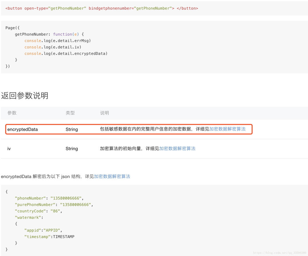 在设置withCredentials 属性为true 的情况下,这个api 可以拿到encryptedData,iv 等敏感信息,encryptedData 需要使用session_key 进行解密,解密后可以拿到的数据如下: