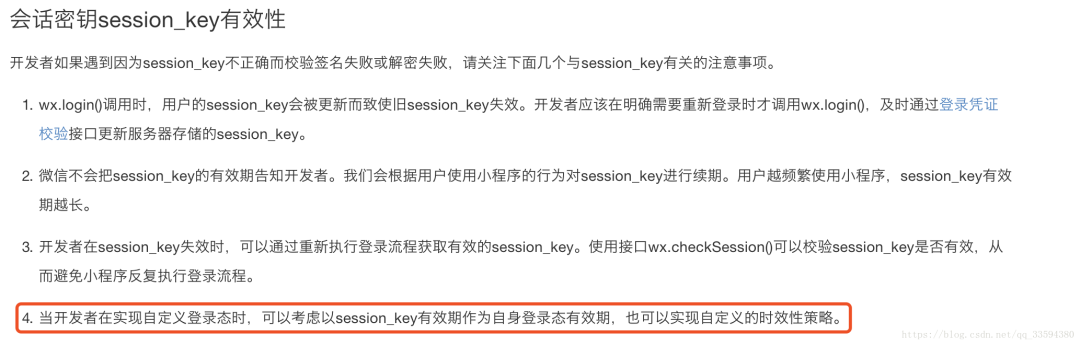因为session_key 存在时效性问题(毕竟是用来查看敏感信息),而小程序前端可以通过wx.checkSession() 来检查session_key 是否过期。所以可以通过这个来作为保存用户登录态的机制,这也是小程序文档中推荐的方法: